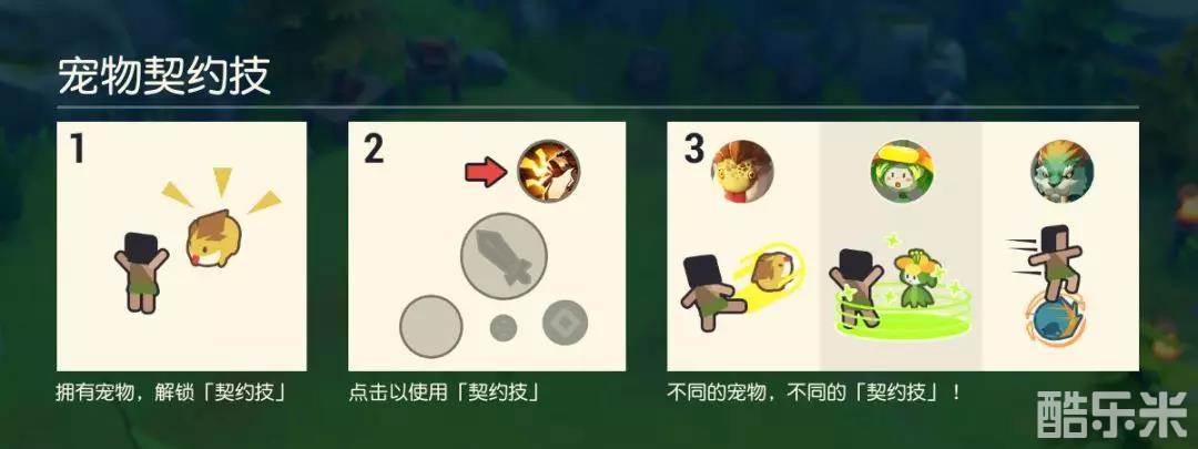 在战斗中,出战宠物会提供一个可手动释放的主人和宠物合体的契约技能。不同类型宠物,合体技能的效果完全不同,有伤害、嘲讽、回复、控制等多种效果。除了合体技能外,宠物在战斗中也可以使用自己的专属技能。