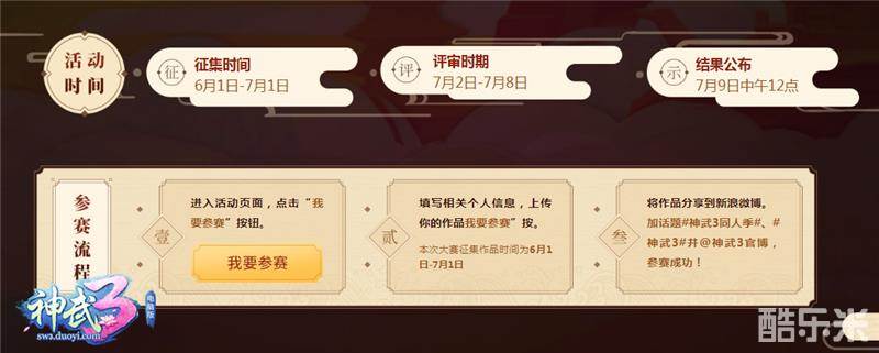 即日起至7月1日,登录《神武3》“盛夏同人季”专题页面,点击“我要参赛”按钮,填写相关个人信息并完成上传,将作品分享到新浪微博,加话题#神武3同人季#、#神武3#、并@神武3官博,即可参与比赛。《神武3》盛夏同人季绘画大赛正式开启,让我们一起来创作最有爱的同人画吧!