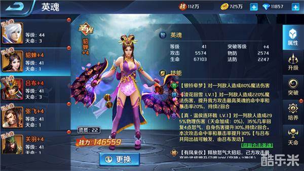 而搭配吕布的缘分英魂貂蝉则是一个后排的法术输出,同样是对一列的敌人造成伤害,组合起来的伤害非常爆炸,而且能够早期怒气集满释放合击技能。