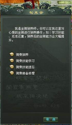 骑乘技能学习:坐骑技能栏除了坐骑自动获得两个技能格子以外其他为未激活状态,需要之后进行拓展,未激活状态视为该格子不存在,要开启坐骑技能栏需要玩家到“宠物商店”购买道具到“坐骑训练师”处开启。开启技能栏后才能拿技能书在“坐骑训练师”处学习技能