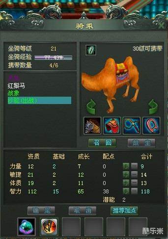 坐骑潜能点:坐骑升级每级会产生2点潜能点作为玩家自动分配,增加到坐骑基础属性中。
