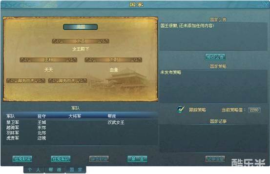 5、国家策略:分为外交和战争策略两种,由国王、丞相、太尉发布