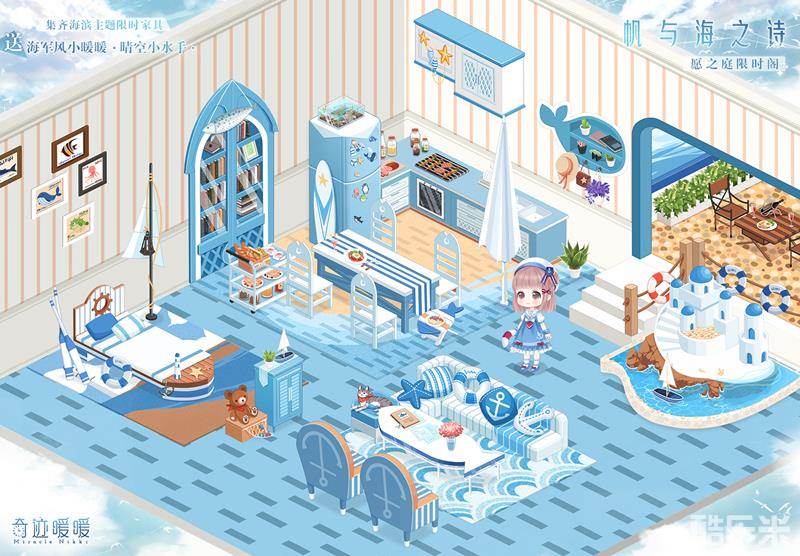 6月6日5:00—6月12日 23:59,在小屋愿之庭的限时抽奖阁“帆与海之诗”许愿,可获得精美海滨主题家具,集齐所有限定家具即可解锁海军小暖暖“晴空小水手”!
