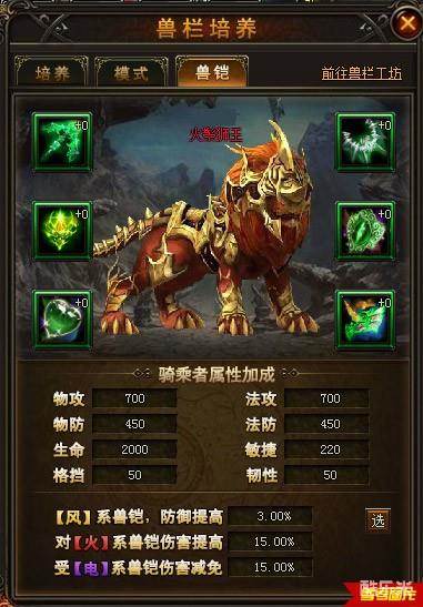 ◆请先进入兽栏界面,在兽栏右边的“兽栏培养”中,会多增加一个新页签-兽铠,此处是目前唯一可以装备/更换坐骑身上六件装备的地方,您可以在这里查看兽铠具体的加成属性,还可以为每个坐骑的兽铠选择一个灵魂锁链属性!