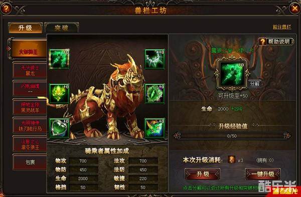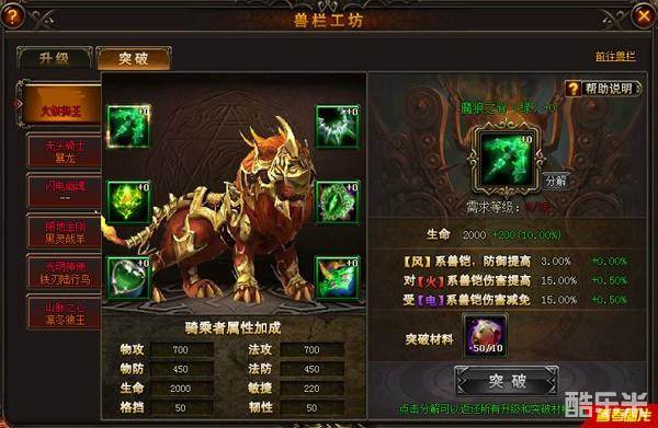 点击“兽栏工坊”图标,进入工坊,可以看到兽铠升级和突破的操作界面: