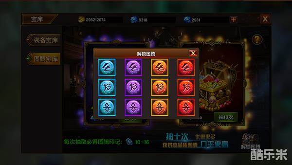 宝库抽奖共分为两种:装备宝库和图腾宝库,分别产出装备和图腾。在装备宝库中,一次抽奖要花费248钻石,而十连抽则只需要1980钻石,冲着八折,还是建议十连抽哦!至于奖励,别担心RP太差,因为保底都会产出橙色1星的装备!还有几率获得唯一产出的极品橙色耳环,在别处都不会得到哦!