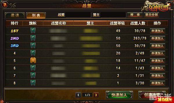 ◆进入跨服主城之后,点击界面右上角战盟面板将直接进入战盟“邀请/列表”界面,玩家可以快速加入战盟,或者创建自己的战盟。也可以通过他人邀请加入战盟。