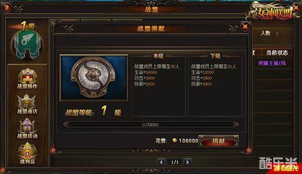 ◆通过战盟捐献可以升级战盟等级并使战盟获得一定权限以及福利。战盟等级的提升可以增加玩家个人攻防血百分比属性(战盟内官职越高加的越高,属性带回单服)、战盟人数上限、战盟元老及副盟主数量。当战盟等级已满,可继续捐献,继续捐献不会增加战盟等级经验,但是仍然可以给捐献者增加贡献度。