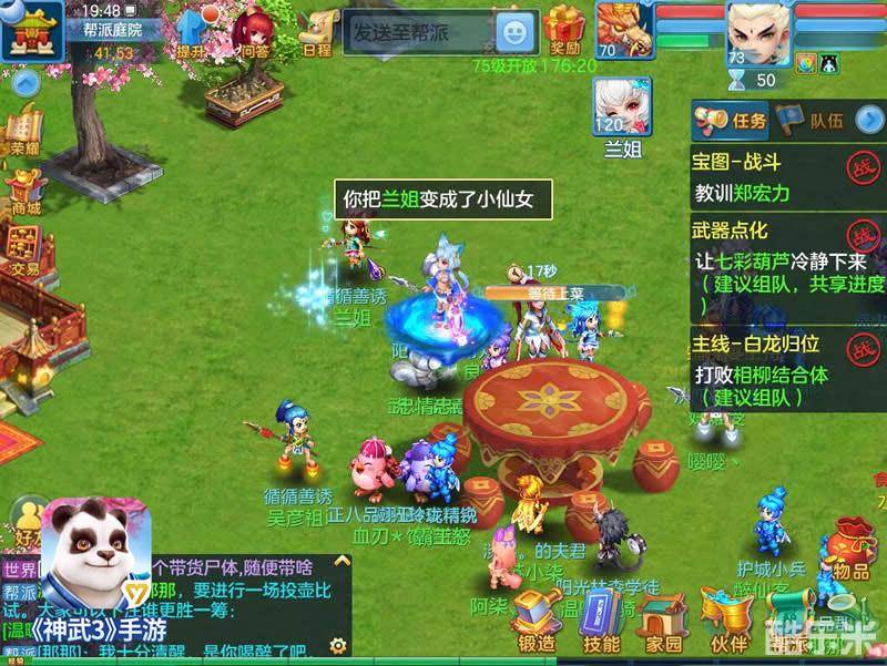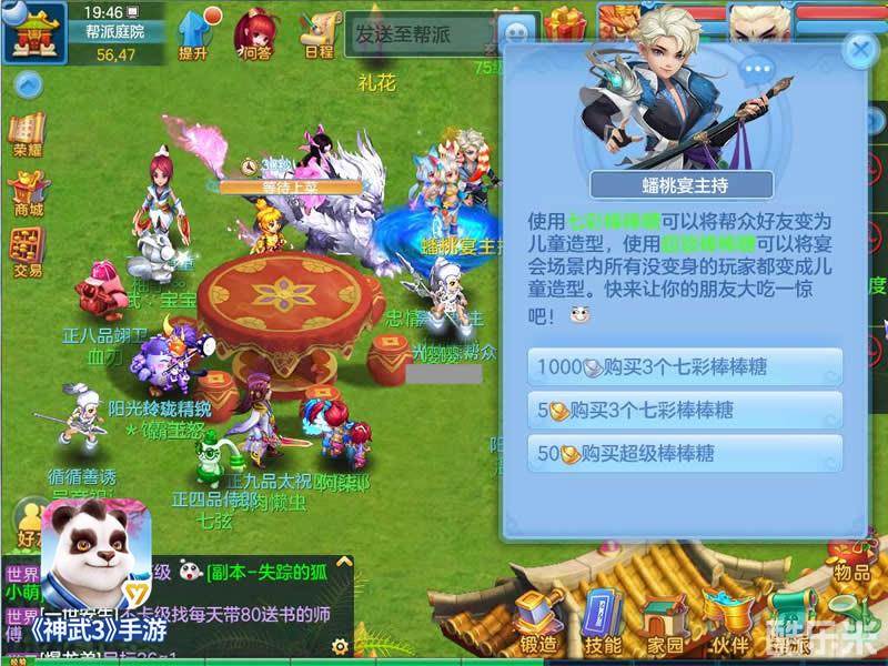 对场景中的好友、帮派成员使用“七彩棒棒糖”后,可令其变为随机的儿童造型;在帮派宴会场景中使用“超级棒棒糖”,可将场景中所有为变身的玩家变成随机儿童造型,在享受缤纷美食的同时,和帮派成员一起“返老还童”,增添帮派宴会的欢乐气氛。