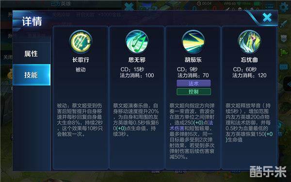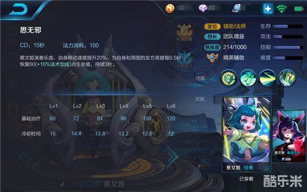 一技能——思无邪:蔡文姬演奏乐曲,自身移动速度提升25%,为自身和周围的友方英雄每0.5秒恢复一定生命值,持续3秒。