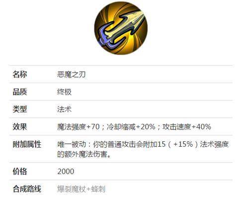 恶魔之刃这件装备比较特殊,是《次元大作战》中增加攻速,提高普通攻击伤害的法术装备。从属性上看,恶魔之刃提供了70点法术强度,20%的冷却缩减,40%的攻击速度。前两个属性对于绝大多数法师来说是很不错属性。然而攻速加成以及恶魔之刃的被动,则是全面提升了普攻伤害。这样一来,这件装备的针对性就很强了,需要普攻打出魔法伤害的英雄,才会优先选择这件装备。