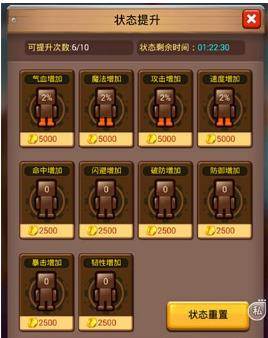 状态提升:点击选项可以获得武道场状态提升,效果持续2小时。每日可提升10次,每种状态第一次提升花费金币2500。