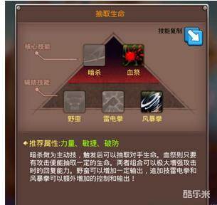 暗杀作为主动技,触发后可以抽取对手生命。血祭则只要有攻击便能抽取一定的生命。两者组合可以极大增强攻击时的回复能力。野蛮可以增加一定输出,追加技雷电拳和风暴拳可以额外增加控制和输出。