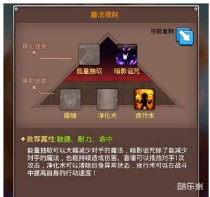 能量抽取可以大幅减少对手的魔法,暗影诅咒除了能减少对手的魔法,也能持续造成伤害。盾墙可以抵挡对手1次攻击,净化术可以清除自身异常状态,疾行术可以在战斗中提高自身的行动速度。