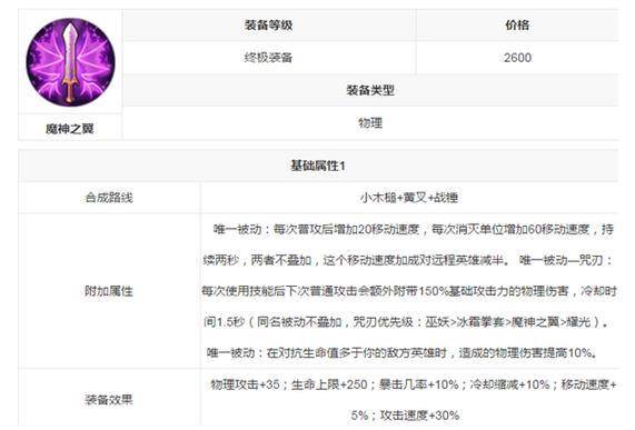 魔神之翼是《次元大作战》中最为昂贵的装备,自然也有最全面的属性提升。从攻击属性到防御属性,每个地方都有加成。对于以物理技能输出的英雄来说,魔神之翼这件装备的被动“咒刃”,更是不错的伤害提升。三个小件的合成路线,看上去也非常的平滑。但是,由于这件装备实在太贵,属性加成很全面但是很少,所以并不是所有英雄都适合出。
