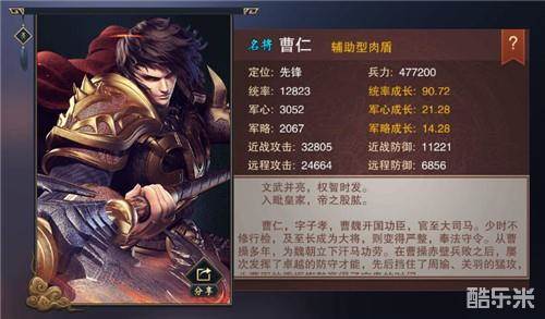 曹仁同样是曹操麾下的得力战将,是曹氏宗亲中少有的能征善战之将。和张辽一样,曹仁也是我们在解锁剧情后就能得到的强力武将,核心技能八门遁甲是游戏中少有的群体护盾,能够在战斗中对全体阵容进行减伤,实在是不可多得的良心技能。在统兵方面,曹仁仍旧有着可观的成长空间,所以即使在高玩的眼中,曹仁在游戏的中后期仍然能够发光发热。
