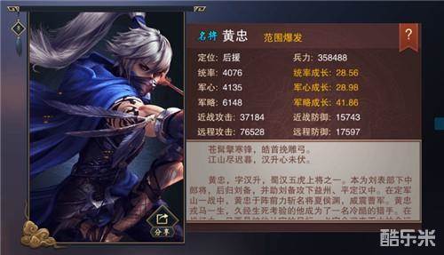 黄忠作为刘备的五虎将之一,以精湛的射术而天下闻名。相比于前面的几位,黄忠的获得方式要稍微难一些,只有在招贤馆中才能得到,但是一次使用十块令牌的话,召集成功的难度也不是很大。黄忠作为一位远程弓兵将领,能为这套阵容弥补远程伤害不足的短板,由于攻击距离较长,黄忠在战场上的生存空间非常好,能够持续不断的提供输出。