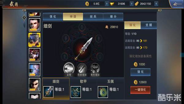 每位武将都有自己的三个神器,分为武器、防具和首饰。强化神器可以提升武将的攻击、防御和兵力等方面的属性,这是提升武将属性的重要来源,相对来说属性的提升成本也比较低,只需要花费铜币就能进行强化。对神器觉醒后,强力武将还会获得觉醒技能,激活的被动技能搭配主动技能会让武将战力大增。除去神器强化以外,玩家还能通过觉醒来提升神器品质,觉醒材料需要升星石等材料,可以通过军演操练等方式获得。