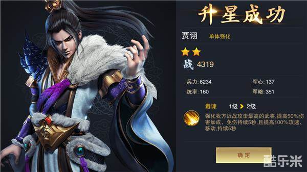 平民武将也有实力者,今天的主人公是辅助型武将—贾诩,单体强化的贾诩虽说是初始的一星级良将,但是经过用心培养之后,辅助能力也算是很强的。搭配攻击型武将尤其是暴击型武将更是能够发挥出更好的效果。