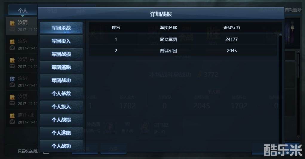 记录军团的总战功、总投入、总杀敌、总战损,以及军团中一些排名。
