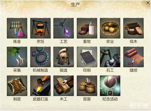 生产技能是《上古世纪》的一项重要游戏内容,玩家可以通过消耗劳动力和材料方式打造武器、建造房屋、加工原材料等,获取战斗以外的游戏乐趣。游戏中目前包含了炼金、烹饪、工艺、畜牧、农业、伐木、采集、机械制造、锻造、印刷、石工、缝纫、制皮、武器打造、木工、贸易共16种生产技能。