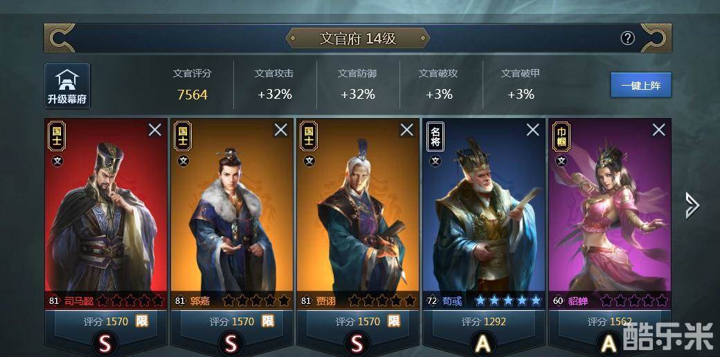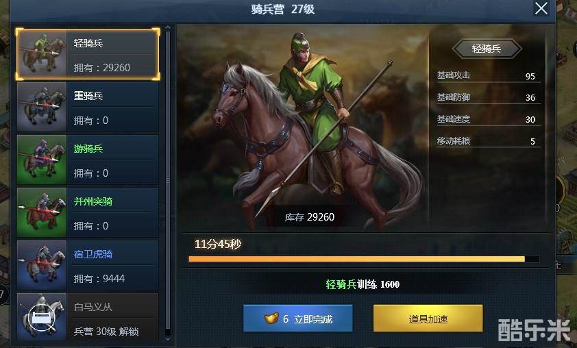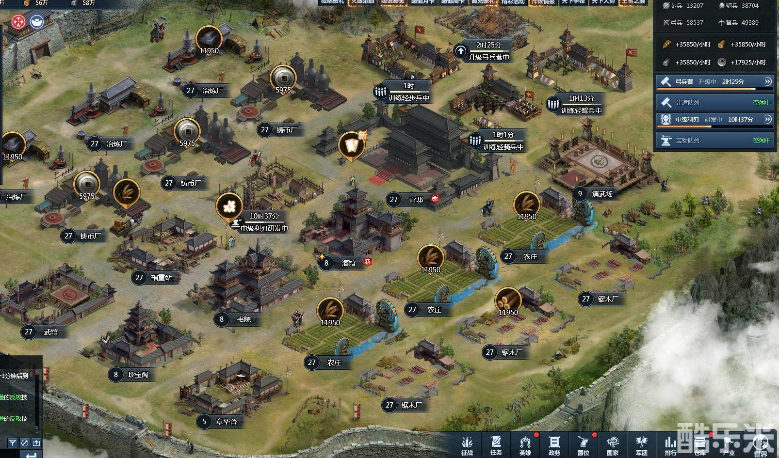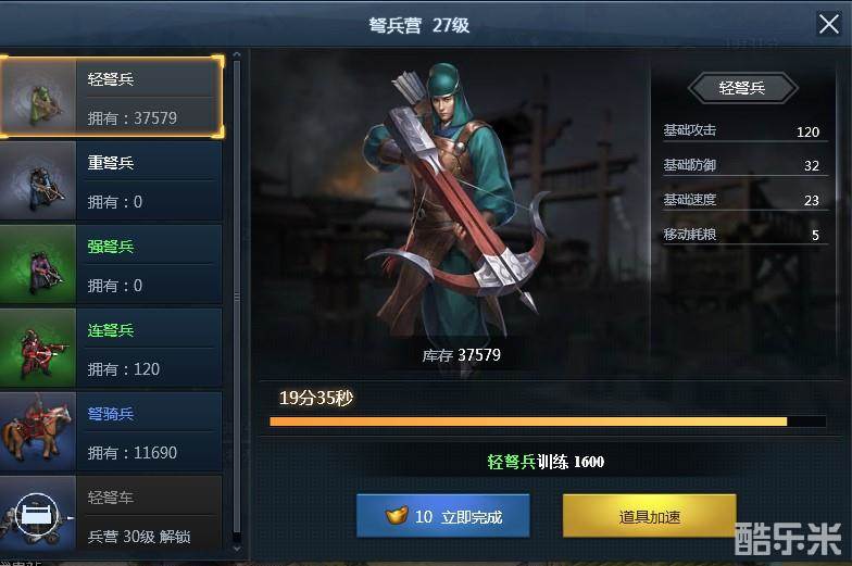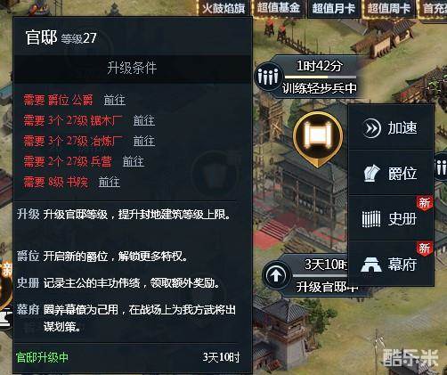 训练各类士兵,但是需要跟着官邸的等级升级,才可以解锁兵种等级,越高级的兵种基础属性越高。