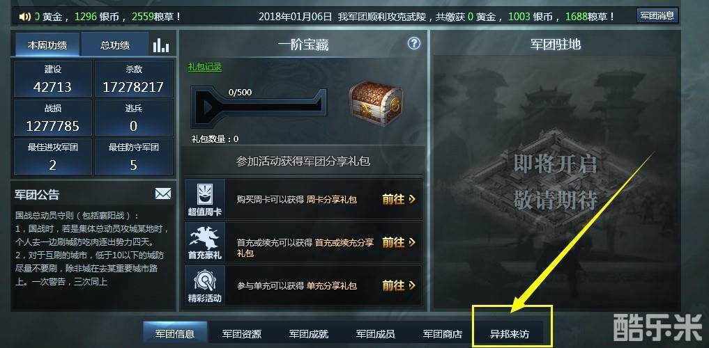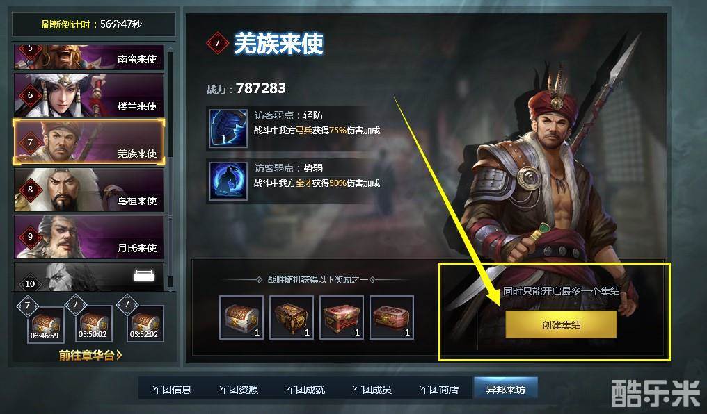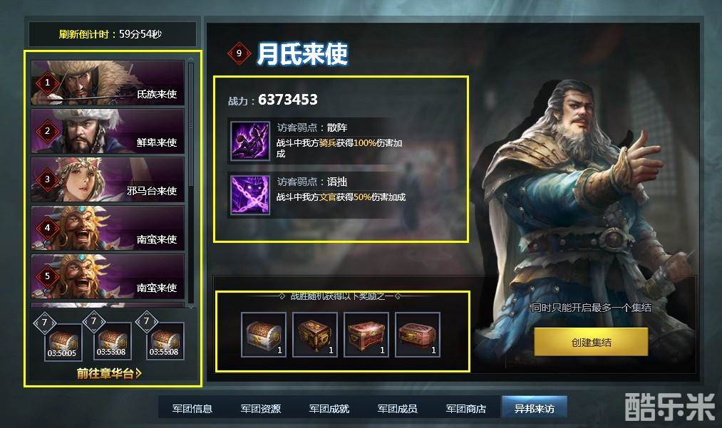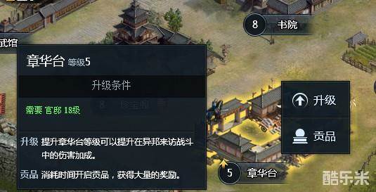 赢得军团副本,对方使者会随机送上贡品给我天朝上国。贡品会出现在封地的章华台里,章华台可以升级,等级越高,打军团副本伤害越高。