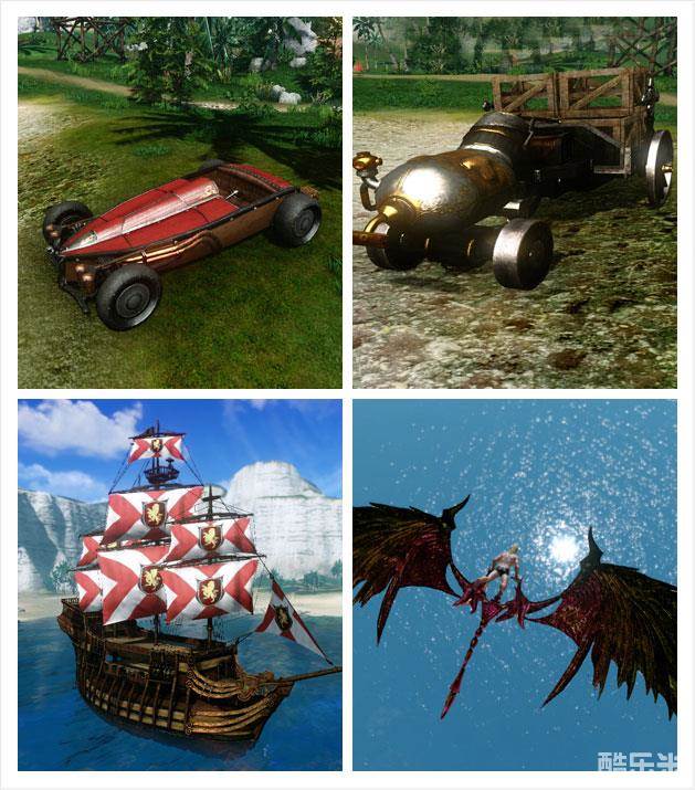 玩家除了动物坐骑,还可以在游戏中通过NPC处购买机械载具图纸,来打造属于自己的个性化机械载具。机械载具包括海、陆、空三种,例如:海上战舰、帅气跑车、空中滑翔翼等。