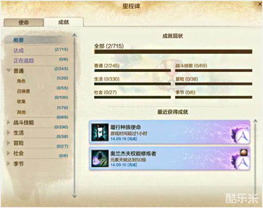 在‘里程碑’中还包括成就系统,在成就系统中没有等级限制,但分为6大类成就。分别为:普通、战斗技能、生活、冒险、社会、季节。在成就概要中,可查看到各大类成就的完成度。达成成就有可能获得对应特殊奖励。