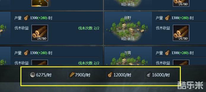 村落、港口产出银两;农田、牧场产出粮草;林场产出木材;矿场产出生铁。