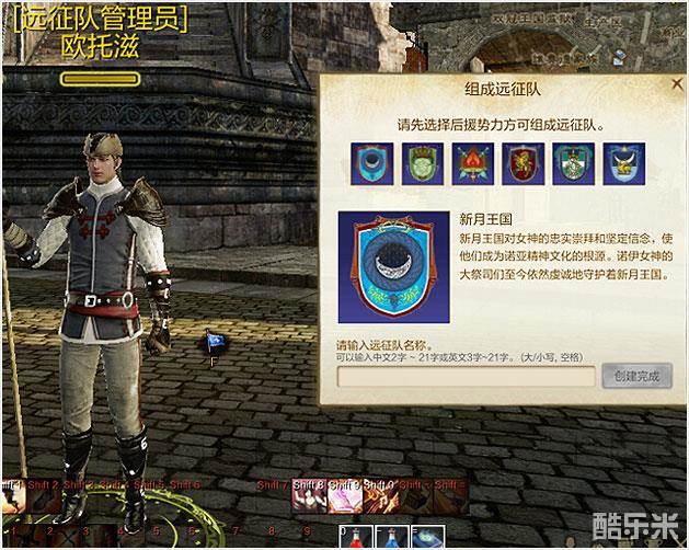 玩家在游戏中,可通过‘远征队管理员’创建远征队,‘远征队管理员’一般存在于主城以及大型村镇。建立远征队最低标准为:由5名5级以上的玩家组成,并需要消耗游戏币1金。达到标准后,需要选择远征队的后援势力。