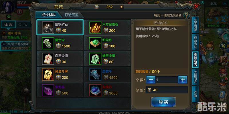 首先,在精炼材料收集上,不能错过任何一个可以产出精炼材料的活动,比如:每日签到、四海八荒、女娲试炼、幻境试炼、矿石采集等等,其中矿石采集是每日必做的。如果无法呆在大氏族的话,建议自己建个小氏族赚氏族贡献,九黎入侵、氏族盛宴、封印之地、氏族运镖等等,每日至少可获得1200+的氏族贡献,可购买30个墨银矿石。