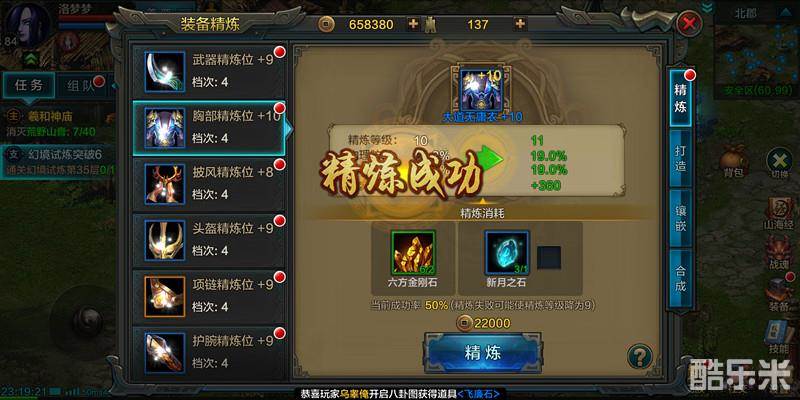 其次,在精炼技巧上,精炼是个耐心的事,不能太着急,一定要慢慢来。备好材料,每天上线时点一下,总的感觉第一下的成功率是很高的。还有就是材料最好多收集点再精炼,第一次没成功的时候,换一个装备再点,成功率也非常高。还有就是换地图,每点一次换一次地图也会增加精炼成功率。