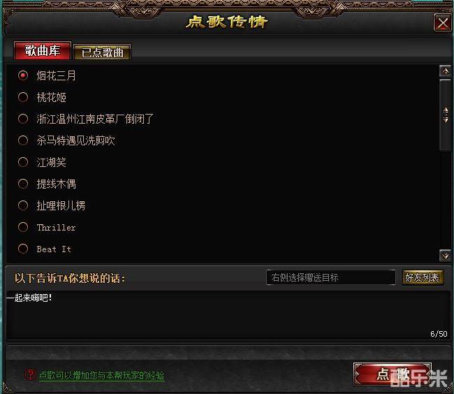 在瑶池中,还可以进行点歌,送给你想送给的人,全服玩家都能够知道你的心意。