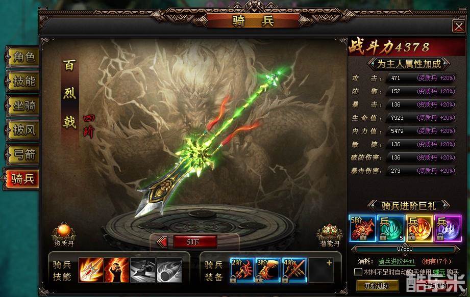 2、骑兵可以进行培养,培养等级越高可以解锁骑兵技能,并且可以穿戴更多骑兵装备。