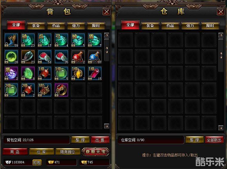 若不常用的道具,也可以将道具放入仓库,在背包中,打开仓库按钮打开。