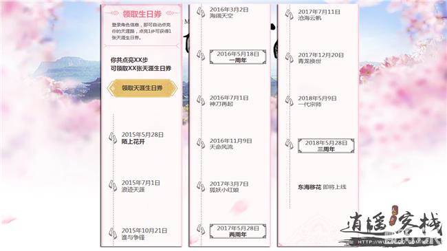 活动期间登录专题页面,绑定区服角色后,即可在页面左侧点亮天涯路,并获取相应数量的天涯生日券。此处所谓“天涯路”,其实就是指我们的游戏历程,根据绑定角色所经历的过往重要版本,页面左侧对应的历程序列会从黑色字样转换为红色点亮状态,活动页面共记录有自“陌上花开”不删档测试以来的13个重要版本,角色每经历过一个版本即可领取一张用于抽奖的生日券。自己能否算得上是老侠客,不妨来检测一下!