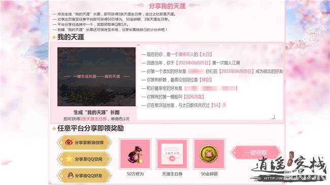 制作一张属于你的游戏简历吧!在活动页面“分享我的天涯”模块中,点击超链图片即可一键生成“我的天涯”长图,上述角色体型、门派、初入江湖的日期、第一个添加的好友、历史最高论剑段位、好友度最高的亲友、第一艘船的名称、与太白醉侠共饮次数等,生成长图即可获赠一张天涯生日券,单角色限1次,侠士还可将自己的天涯长图分享至新浪微博、QQ空间或QQ好友等平台,即可领取包括50万修为、天涯生日券、50金碎银在内的分享好礼!