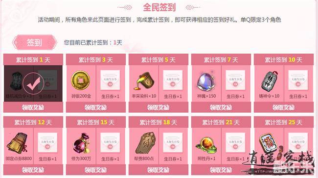 保持游戏活跃,即可轻松揽获实用道具及绑定点券!活动期间可登录页面进行签到,完成累计签到,即可获得相应的签到好礼,单Q限定三个角色。累计签到25天即可将所有奖励尽收囊中,最高档奖励为解锁神兵章回所必须的“缘材·进”×6,更有人气商品照性丹倾情献礼!只需累计签到21天!8800绑定点券累计签到12天即可获得!每达成一项累计签到的天数要求,除了可以领取游戏道具外,还将附赠一张生日券,共有十张生日券可供获取,建议各位侠士至少坚持签到21天,新门派移花宫将在7月1日正式上线,或许希望尝试新门派的你,也会对改换性别体型感兴趣哦!