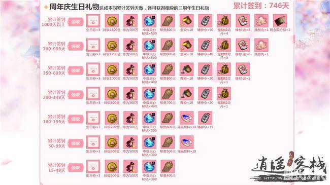 回馈好礼发放中!活动统计2018年5月25日前的签到数据,侠士可根据自己角色历史签到总天数领取对应奖励。共有累计签到15-49天、50-99天、100-199天、200-349天、350-699天、700-999天、1000天以上七个奖励档位,奖励包括生日券、碎银、修为、中级天心秘钻、帮贡、瑶光染料、点染·金莹、点染·竹青、铸神令、宠物续命丹、缘材·进、洗颜丸、琉金双行扣等,奖励的丰厚程序前所未有,堪称大手笔!千万不要错过!