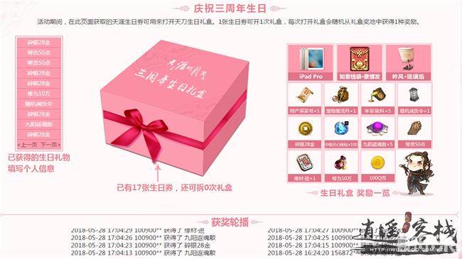 通过多种活动获取的“天涯生日券”,可用于启封礼盒,随机抽取一件奖励,奖池包括iPad Pro、吟风·琉璃焰、100Q币、如意钱袋·豪情发、特产采买书、宠物复活丹、丰彩染料、随机减负令、碎银、中级天心秘钻、九阳返魂散、帮贡、缘材·进、修为等,快来试试手气吧!