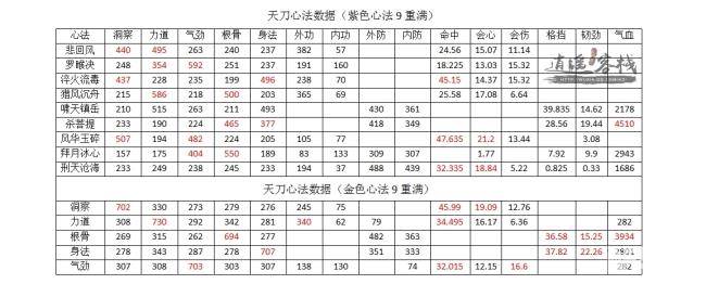 “一代宗师”武侠竞技版本已经更新五天啦,随着版本的更新,不仅仅是有了新玩法,心法也随之更新了,紫色心法开放第九重的剩余半个盘,金色心法第九重同步新增4个枢机,在心法更新了新枢机以后,有的小伙伴就要开始谋划心法顺序了,到底是哪一本心法更符合自己的需求呢,这里我们将最新版本的心法数据统计出来了,如图所示。