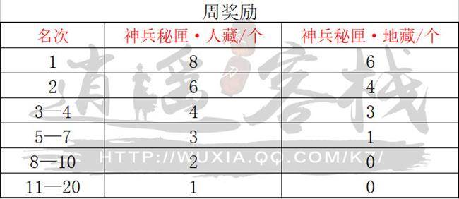 5、周奖励:每周将根据上周最高名次来发放奖励,具体如下: