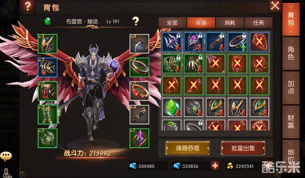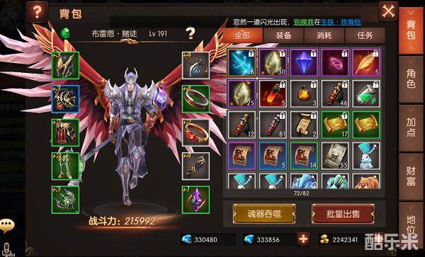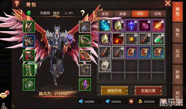 在游戏的右下角,点击背包即可进入背包界面。背包左边是职业的装备及外观展示,背包右边包括全部、装备、消耗、任务等部分。背包右下角可以查看游戏内的钻石及金币数量。通过魂器吞噬及批量出售,可对背包进行处理。