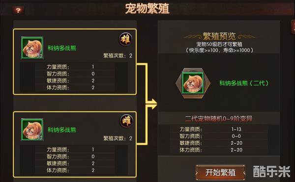 游戏将宠物分为雌雄两种群体,每个宠物的品质、类型差距巨大,可繁殖的次数也不同。玩家可以前往野外boss、战盟或商城获得宠物。《战火纪元》游戏中参与繁殖的宠物需要是同类型、同一代的雌雄宠物。一代宠物需要达到50级以上,欢乐度>=100,寿命>=1000才可繁殖。一代宠物繁殖将获得二代宠物,并增加随机0-9阶变异属性。