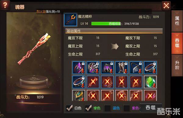 通过吞噬装备,可以对魂器属性大幅提升。吞噬装备之后,会增加吞噬经验、魔法精粹等级和战斗力。消耗青空器灵,可以升阶魂器。