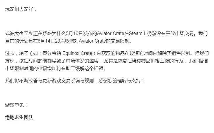 今天,《绝地求生》在官方微博宣布,为防止市场体系被滥用,导致游戏稀有物品价格上涨,官方决定决定将在6月14日解除飞行员箱子(Aviator Crate)的交易限制。