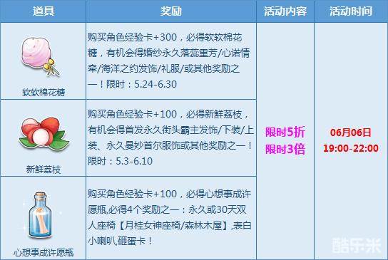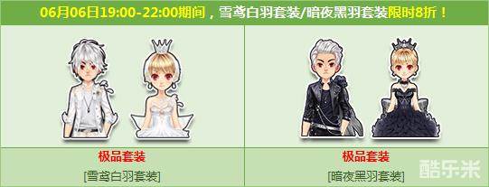 6月6日好礼大放送,19:00-22:00期间,【雪鸢白羽套装】/【暗夜黑羽套装】限时8折,【软软棉花糖】/【新鲜荔枝】/【心想事成许愿瓶】三款宝箱限时3倍+5折,有机会得永久双人座椅【森林木屋】或其他极品奖励!