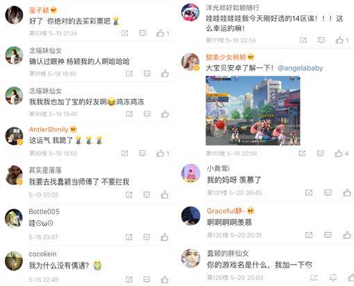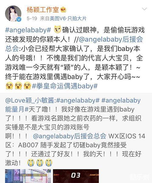 随后,粉丝们更是纷纷开始脑洞大开起来,由于baby是全游戏唯一第一天就有“颖”的人,因此有玩家调侃“是颖本颖了”的评论让Angelababy后援会总会也跟着调皮了一下。而细心的玩家发现,虽然拥有颖,但baby还是低调地选择了不知火舞作为主城形象,得到了粉丝“但是气质还是出卖了你”的善意玩笑。而安卓区的玩家则发出了“麻烦baby也来看看我们”“我马上去买iPhone”的评论。这种良性的互动,促进了玩家和粉丝自主的二次传播。