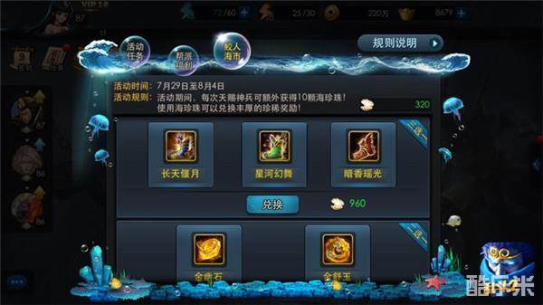 在一系列福利活动中,鲛人海市是唯一可掉落金色套装靴子的活动:截止至8月4日活动结束前,各位玩家在游戏中每使用一次“天赐神兵”功能,即可额外获得10颗海珍珠——积累到一定数量后,将海珍珠与鲛人进行交易,便能够兑换包括金色套装靴子在内的各种稀有奖励,使英雄的战斗力提升至全新高度。时间有限,心动不如马上行动噢!